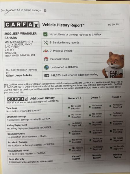 READ JD POWER REVIEWS. The 2002 is one of the choices from this whole generation of TJs. This one is a great example. Its clean, rust free, and the paint and interior are in exceptional condition. The soft top is brand new! It is road ready as it sits with no known issues. COME TRADE WITH US; WHERE YOU LEAVE WITH A SMILE AND A "FULL" GAS TANK!