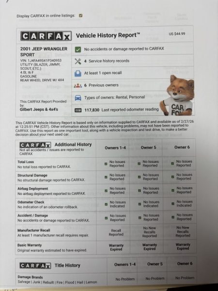Their remains lots of TJ followers. If you are one of them, and regret that you did not buy in while the nicer older ones were available, this could be the time to make your move. This 01 is as solid as they come with no rust or significant cosmetic flaws to report. The interior is showing its age somewhat, but nothing that cannot be easily corrected. The soft top and tires are good. It has been inspected, cleaned and ready for its next owner. CarFaX reports no accidents. COME TRADE WITH US; WEHRE YOU LEAVE WITH A SMILE AND A "FULL" GAS TANK!