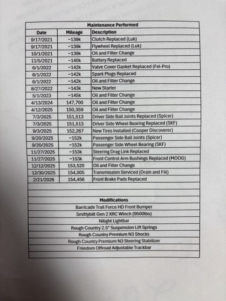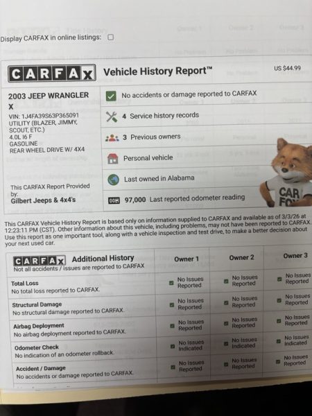 This is a good solid JEEP WRANGLER; The paint and interior is showing its age, but not so bad as to be a deal breaker. It runs and drives great. The pictured page shows service intervals and the add-on equipment. The soft top is in good condition as are the tires. Clean CAR FAX! COME TRADE WITH US; WEHRE YOU LEAVE WITH A SMILE AND A "FULL" GAS TANK!